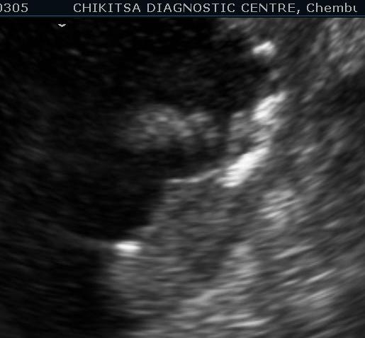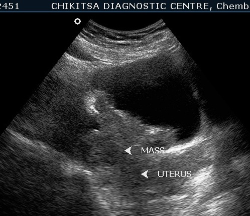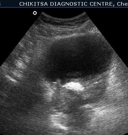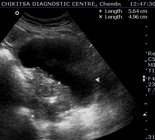 5 5 cm x 5 cm size ill-defined heterogeneous area in the posterior wall of the urinary bladder which is thickened and measures upto 0.6 cm in thickness. Large solid calcific areas are noted in the thicknened portion of the wall urinary bladder. Suggestive of schistosomiasis of the urinary bladder (possibly with malignant change).