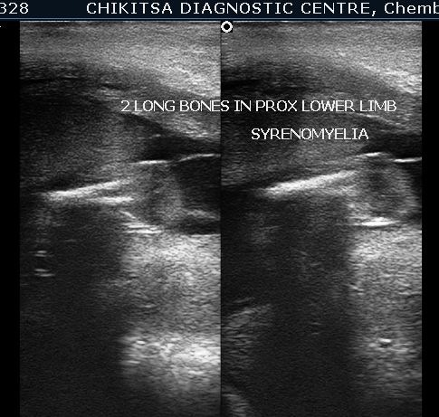 The differential diagnosis may be difficult when a "mermaid syndrome" (the most rare) with cystic kidneys is present. Because oligo-anhydramnios is almost always present, the injection of saline solution in the amniotic cavity may improve the visualization of the fetal anatomy. Sirenomelia is differentiated from these conditions by the anomaly of the leg: reduced numbers of long bones, abnormal proximity of the femurs, and absence of motion of the legs