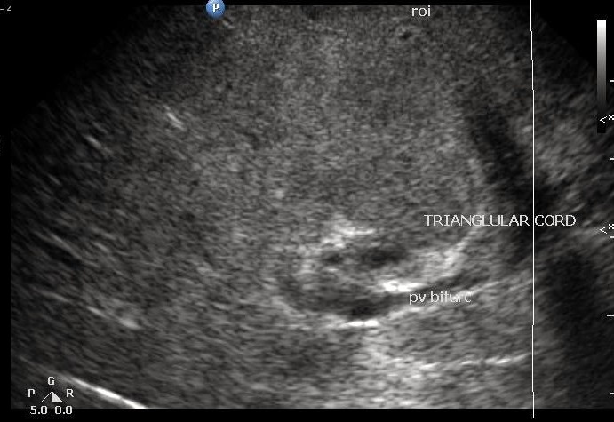 Triangular cord sign is a thick tubular or triangular echogenic density (fibrous ductal remnant) along the anterior aspect of the portal vein at its bifurcation into the right and left branches.