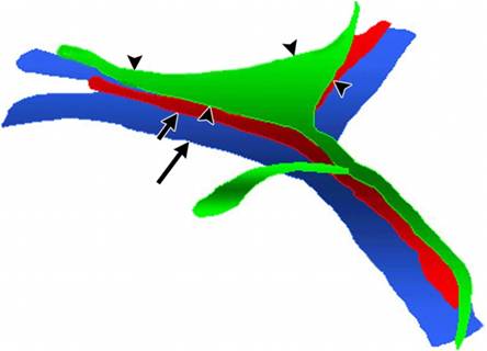 Schematic drawing represents the anatomic relationship between the fibrous ductal remnant and blood vessels around the porta hepatis. The triangular, cone-shaped, fibrous ductal remnant (black arrowheads, green) is positioned anterior and slightly superior to the portal vein (long arrow, blue) and the hepatic artery (short arrow, red).