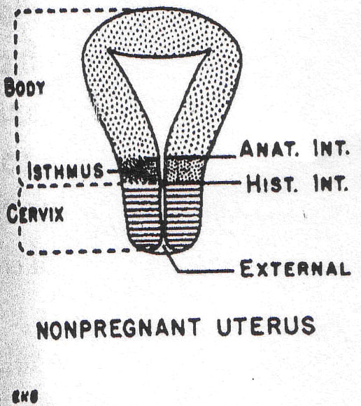 On the surface of the non-gravid uterus about midway between the apex and base, is a slight constriction, known as the isthmus, and corresponding to this in the interior is a narrowing of the uterine cavity. The portion above the isthmus is termed the body, and that below, the cervix. The isthmus of the uterus is therefore the constricted part of the uterus between the body and the cervix. The length of the isthmus is about 0.5 cm -1 cm and its cavity enters the internal os.