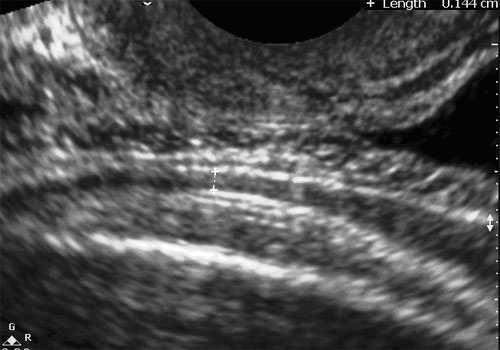 Picture shows measurement of the thickness of lower uterine segment in the 1st trimester using a 7.5 MHz. transvaginal probe.