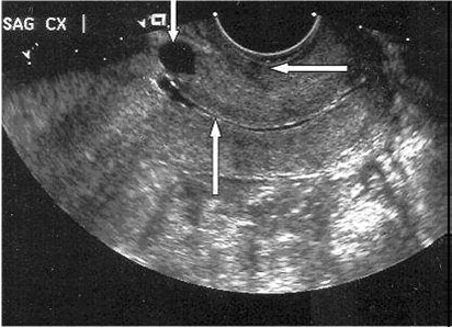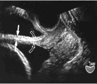 Transvaginal sonography showing the lower uterine segment and bladder full. Open arrow indicates uterine wall; solid arrow indicates bladder wall.